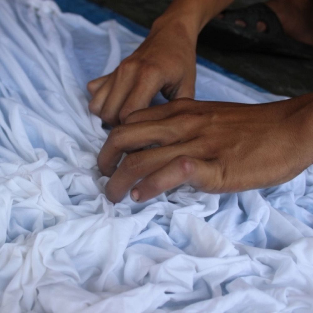 The traditional Indonesian Batik process involves applying hot wax to the areas that should resist dye, and then dipping the fabric into dye. Once colour has transferred, the wax is boiled or ironed out to reveal the full pattern. This process is done entirely by hand, and repeated for more layered and multicoloured designs.