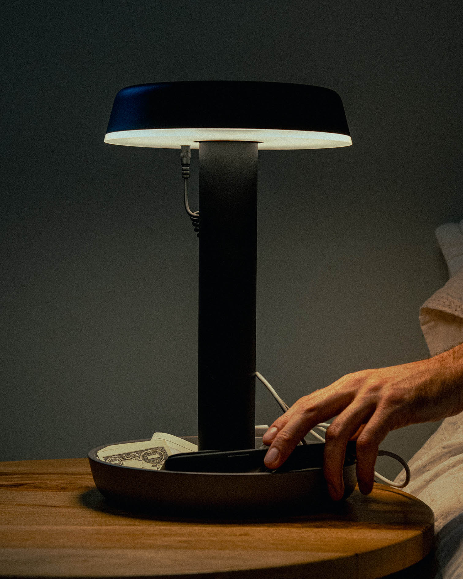 - Table Lamp – Flexible lighting through thoughtful design. The flippable head directs light upward or downward, while a 3-step dimmer lets you adjust brightness. Smart features include a USB-C port for device charging and a dish-shaped base for phones or small essentials.