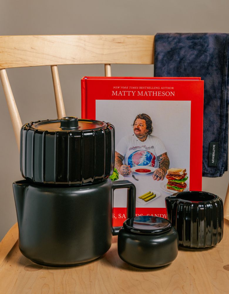 Elevate your daily rituals with this time-out set. Take a minute to pour yourself a warming coffee, sit with a best-selling book, and have Matty Matheson lead you through his most made meals. We include a set of Matheson Placemats because they can camouflage a coffee drip like it never happened.